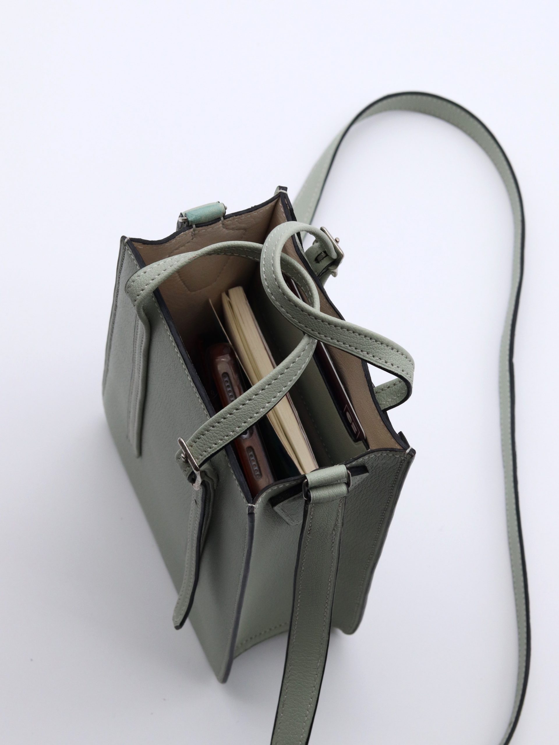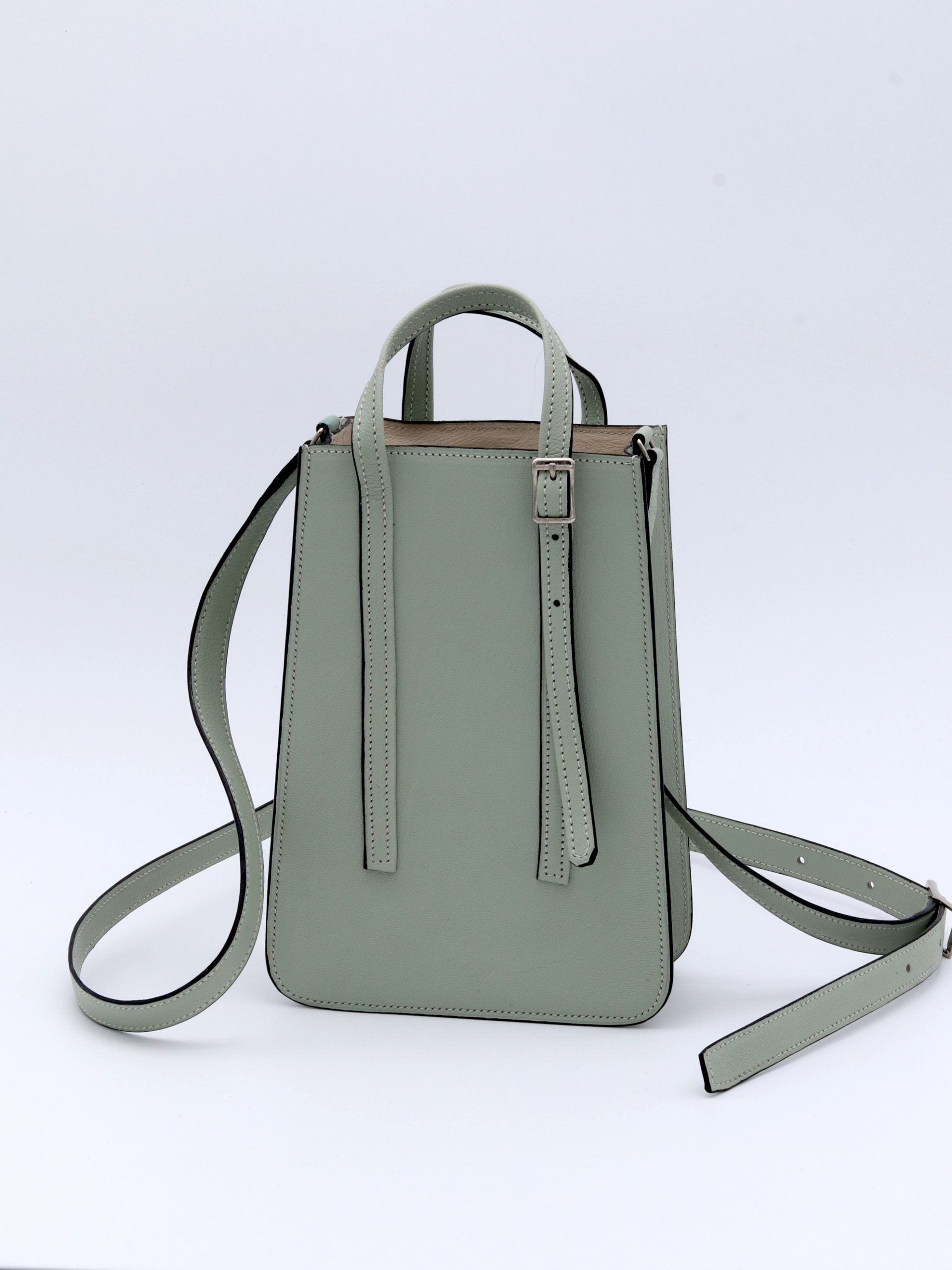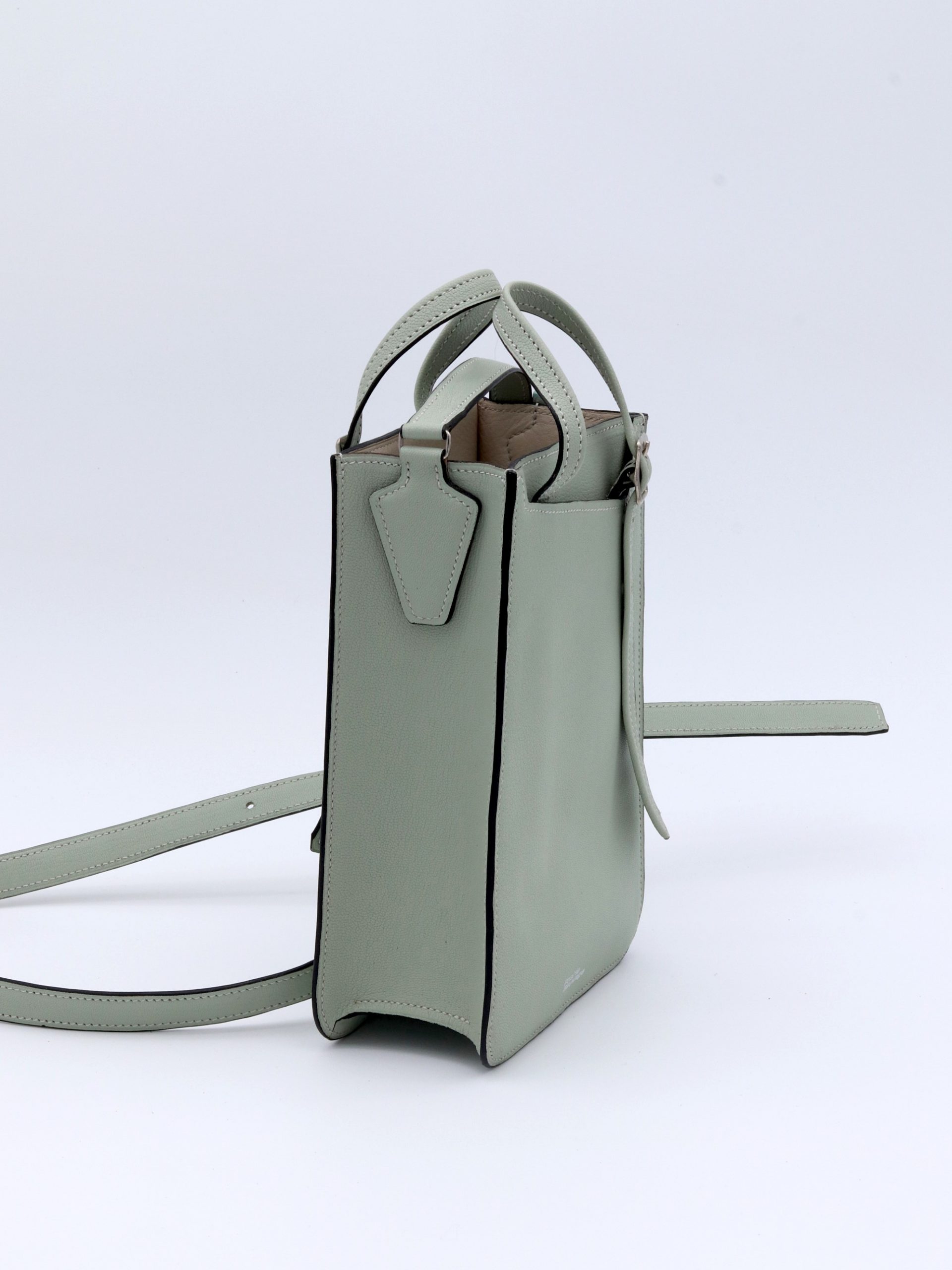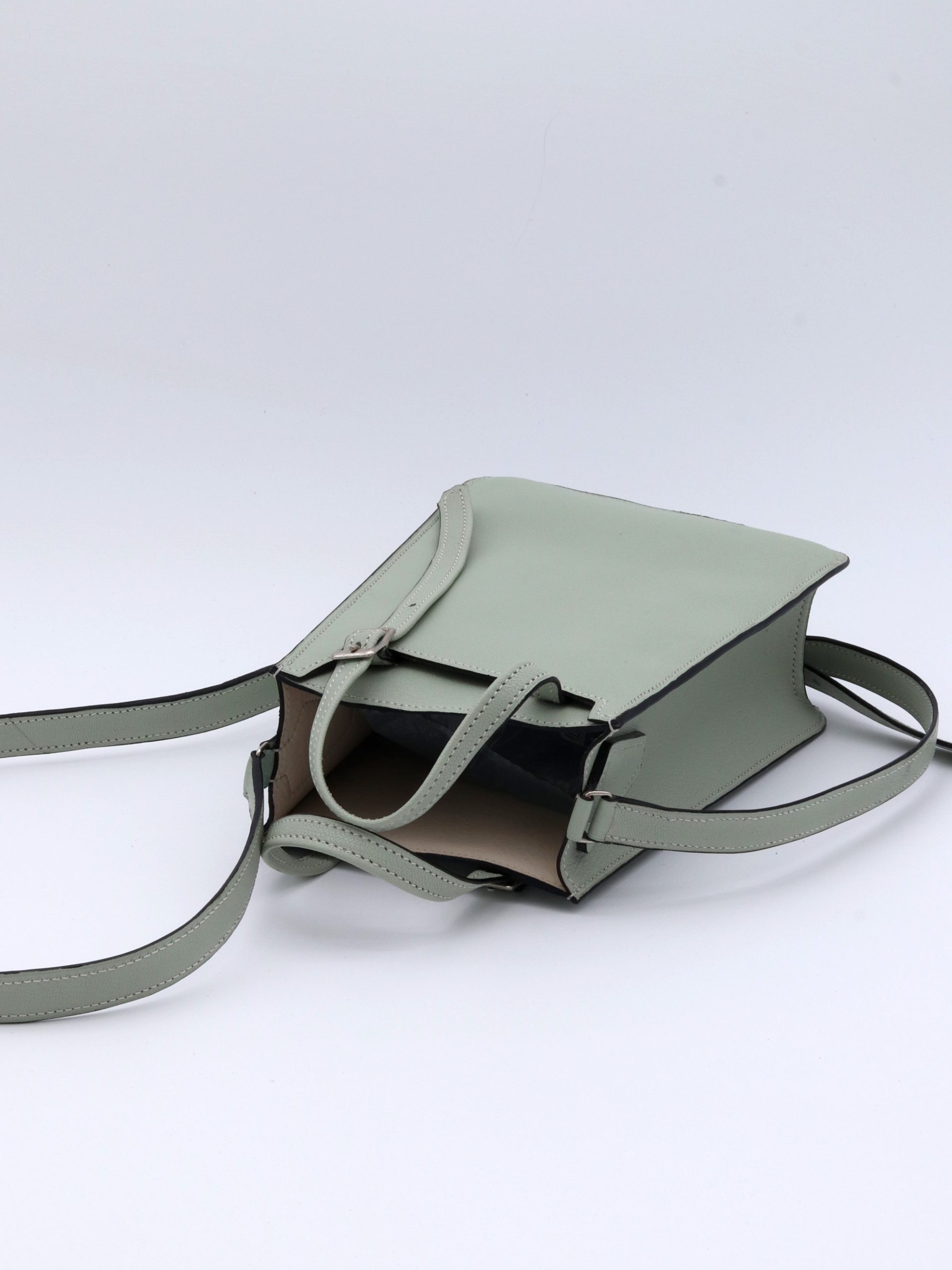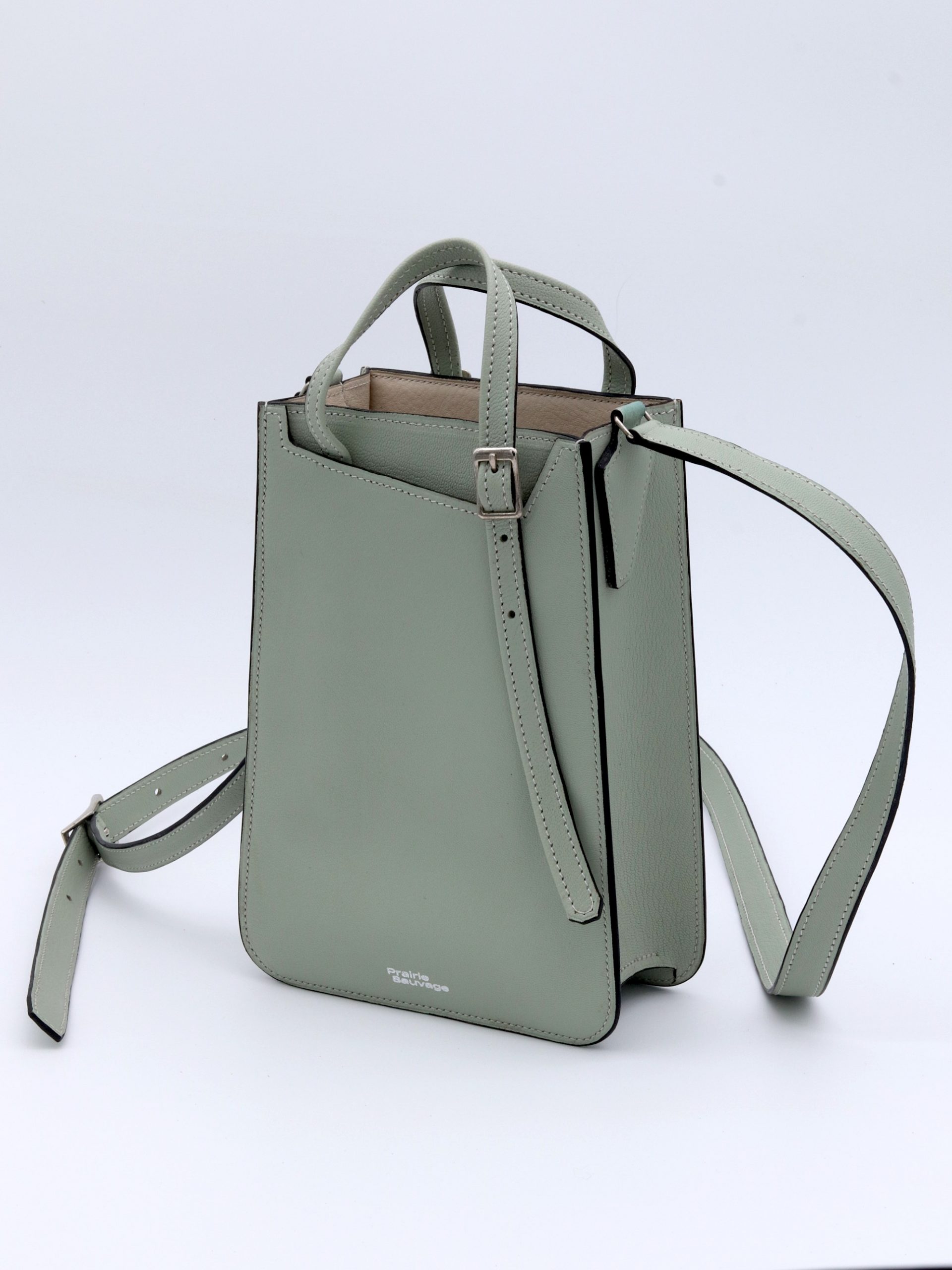 Point de départ de la collection, ce sac en cuir de chèvre vert tilleul s’inspire du mobilier des années 70 avec ses courbes anguleuses qui dissimulent un rangement extérieur pratique. Compact en apparence, il peut pourtant accueillir de nombreux objets. Entièrement doublé, il dispose d’une poche à la taille d’une carte bancaire, d’une bandoulière et de deux poignées réglables, lui permettant de s’adapter à vos besoins avec élégance. Toutes les coutures sont réalisées à la main, à l’exception de la bandoulière.