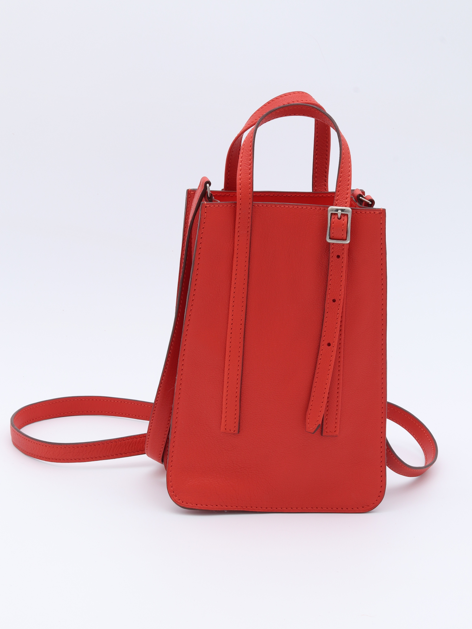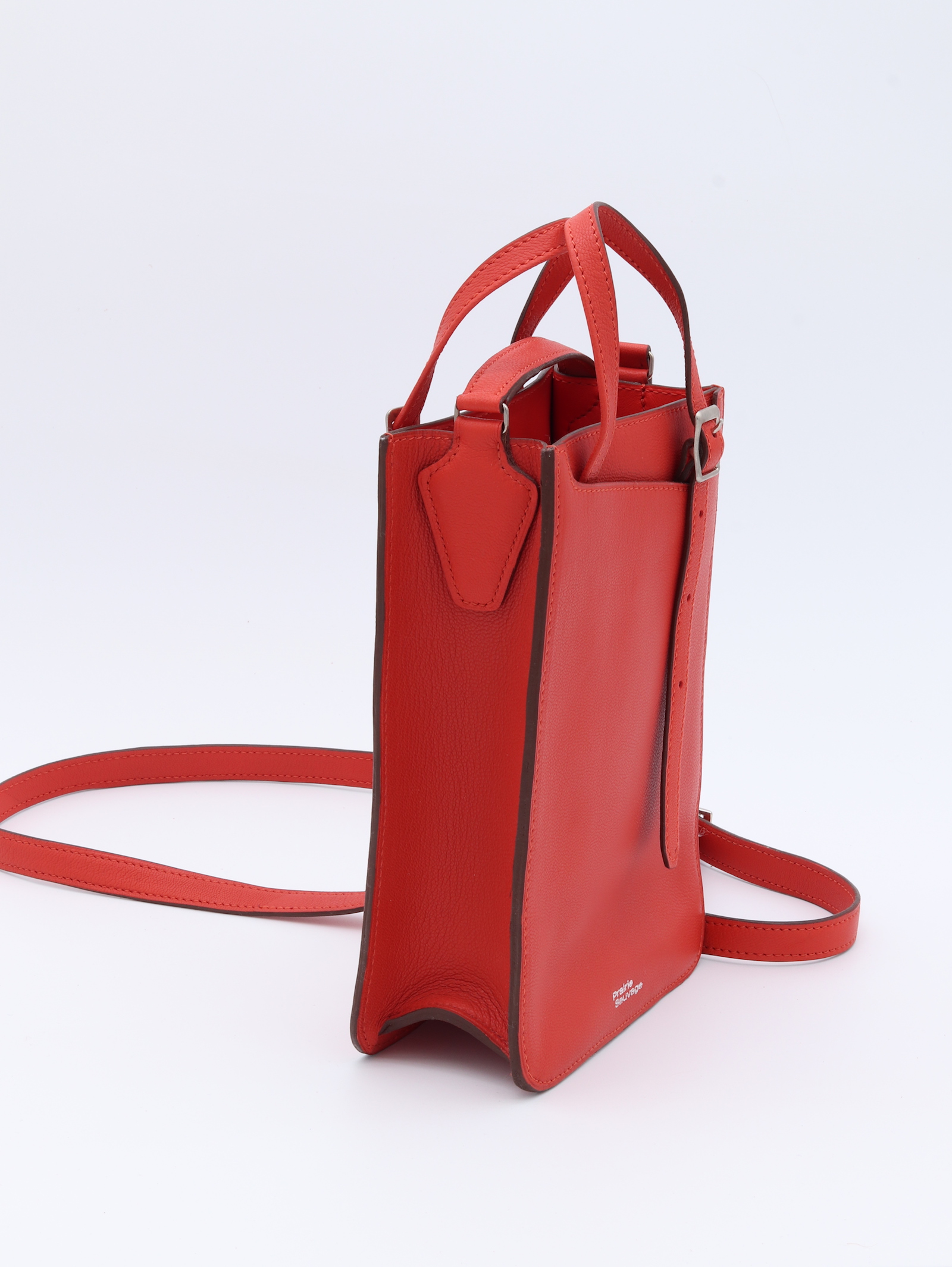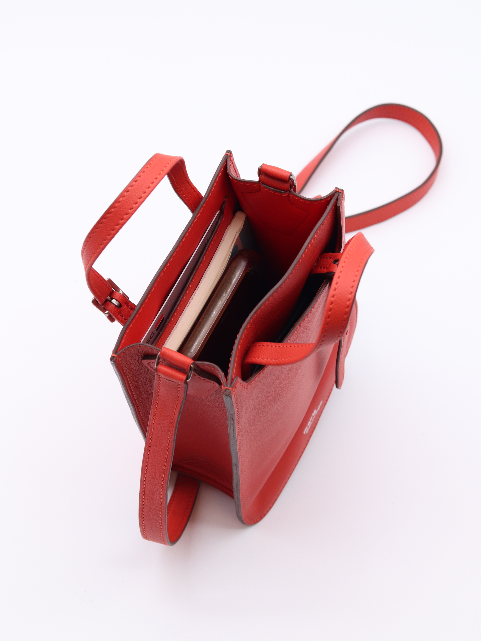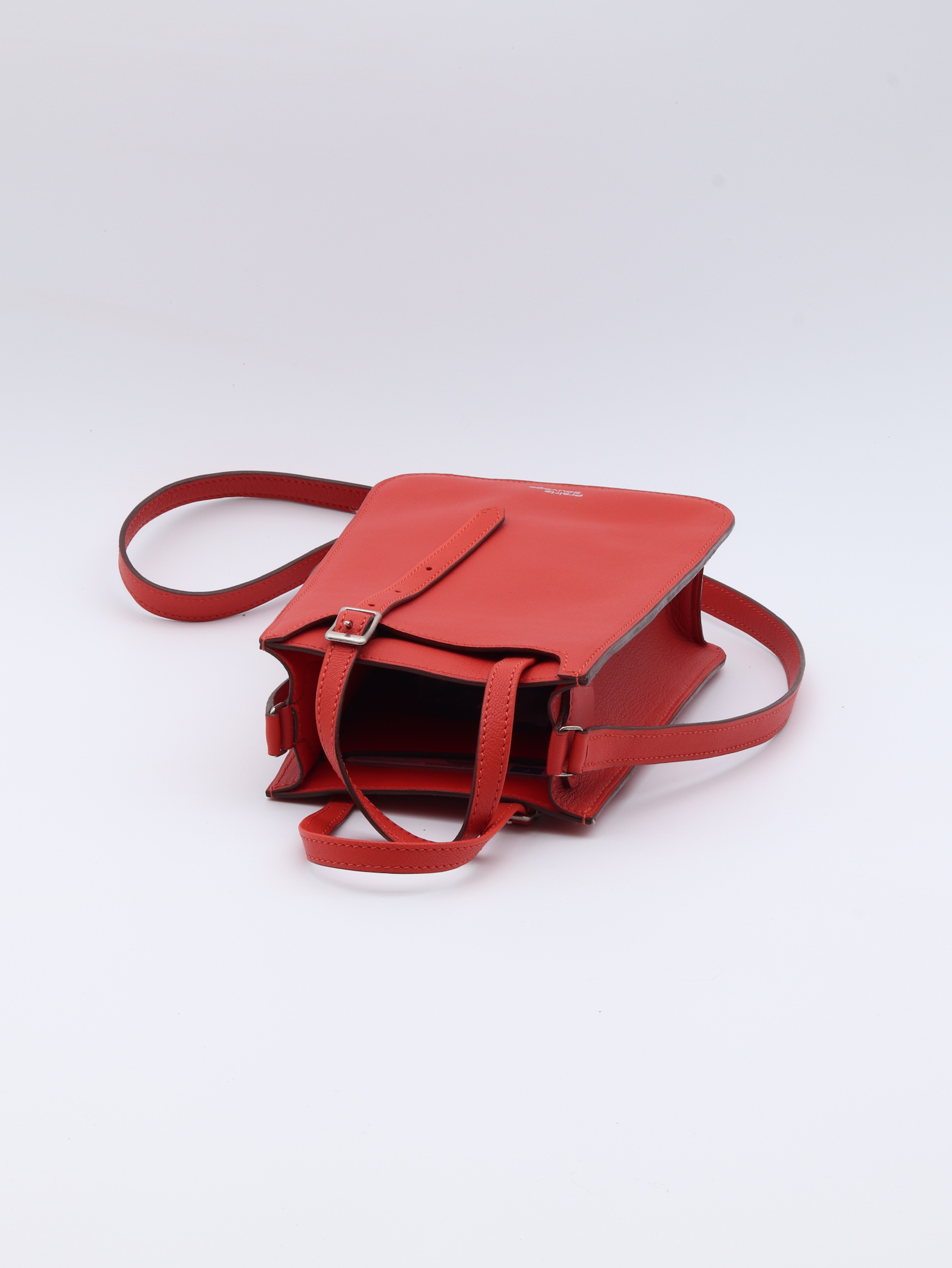 Point de départ de la collection, ce sac en cuir de veau lisse rouge orangé s’inspire du mobilier des années 70 avec ses courbes anguleuses qui dissimulent un rangement extérieur pratique. Compact en apparence, il peut pourtant accueillir de nombreux objets. Entièrement doublé, il dispose d’une poche à la taille d’une carte bancaire, d’une bandoulière et de deux poignées réglables, lui permettant de s’adapter à vos besoins avec élégance. Toutes les coutures sont réalisées à la main, à l’exception de la bandoulière.