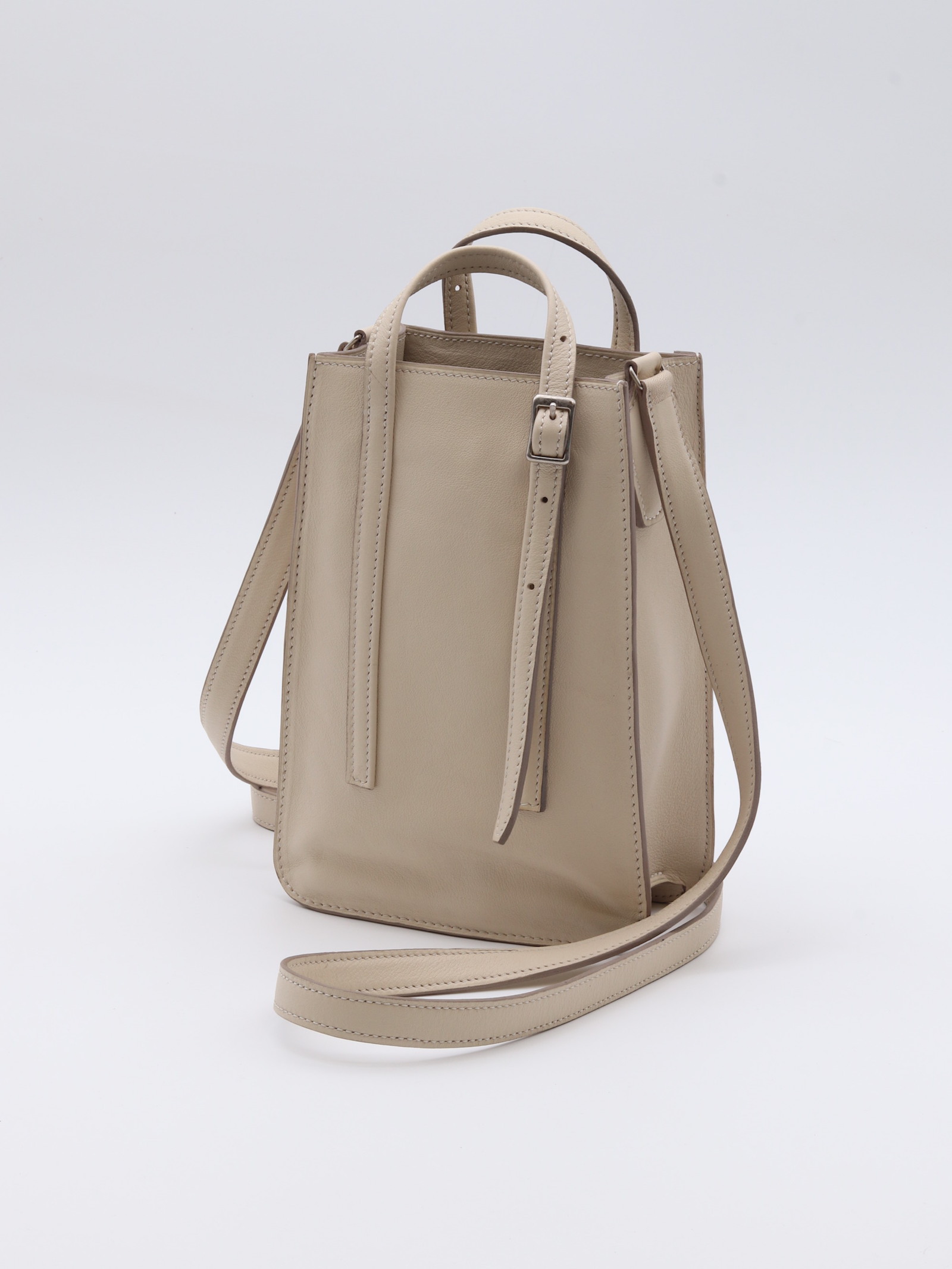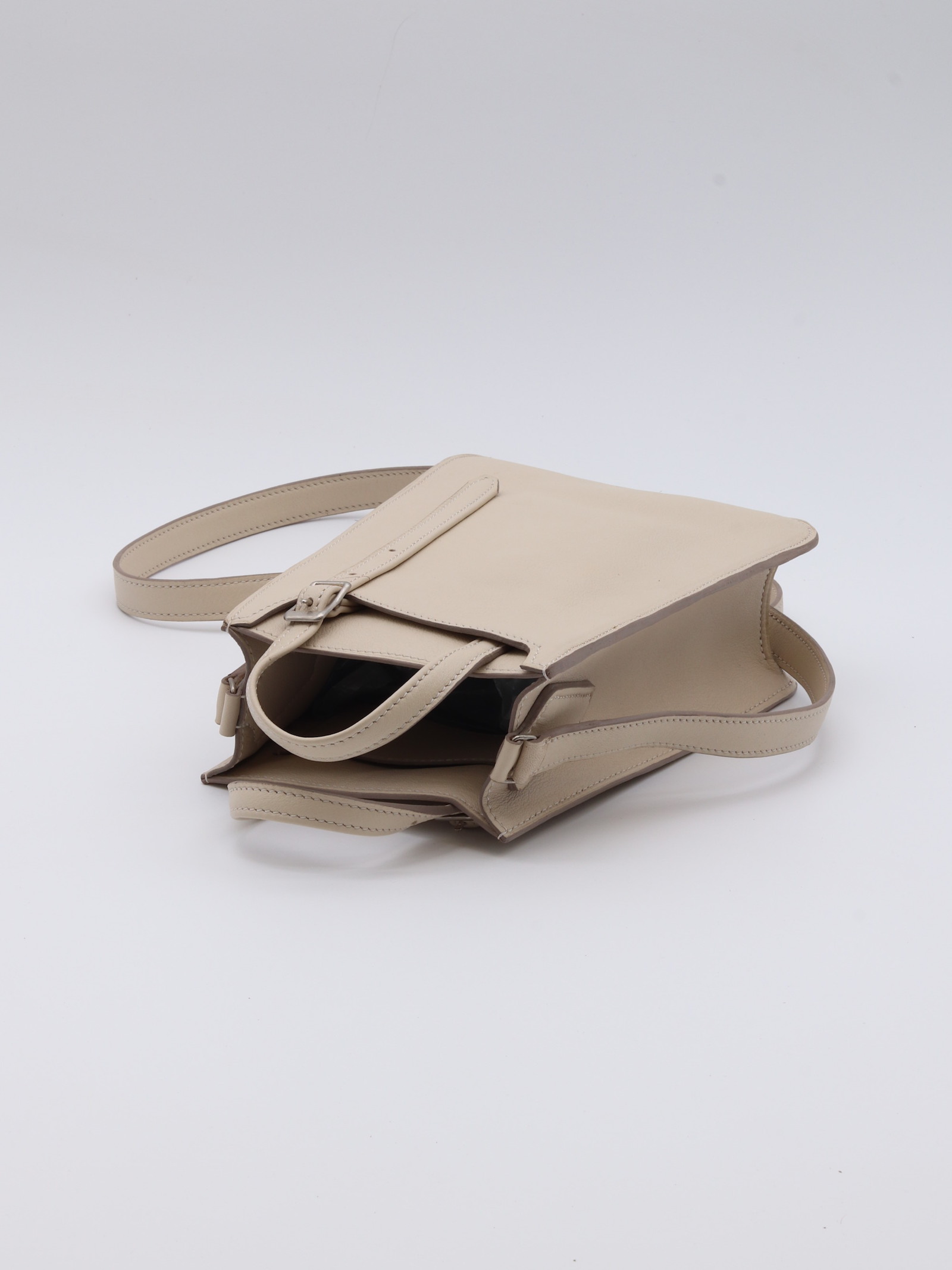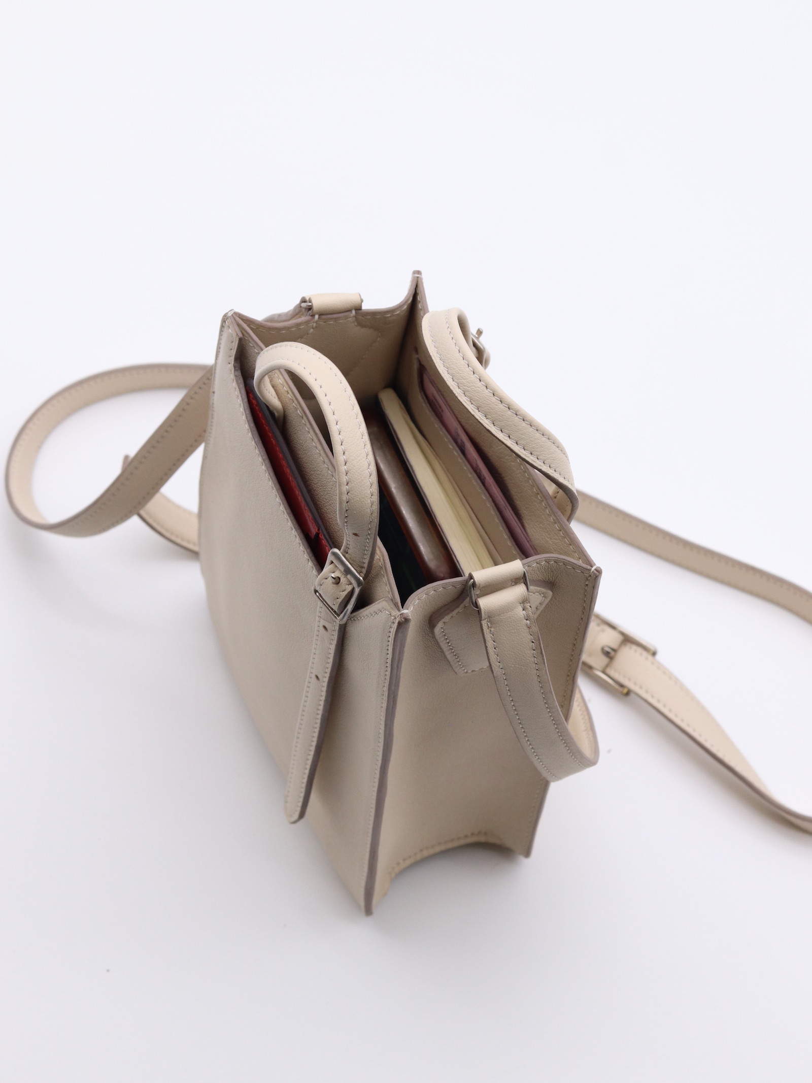 Point de départ de la collection, ce sac en cuir de veau couleur crème s’inspire du mobilier des années 70 avec ses courbes anguleuses qui dissimulent un rangement extérieur pratique. Compact en apparence, il peut pourtant accueillir de nombreux objets. Entièrement doublé, il dispose d’une poche à la taille d’une carte bancaire, d’une bandoulière et de deux poignées réglables, lui permettant de s’adapter à vos besoins avec élégance. Toutes les coutures sont réalisées à la main, à l’exception de la bandoulière.