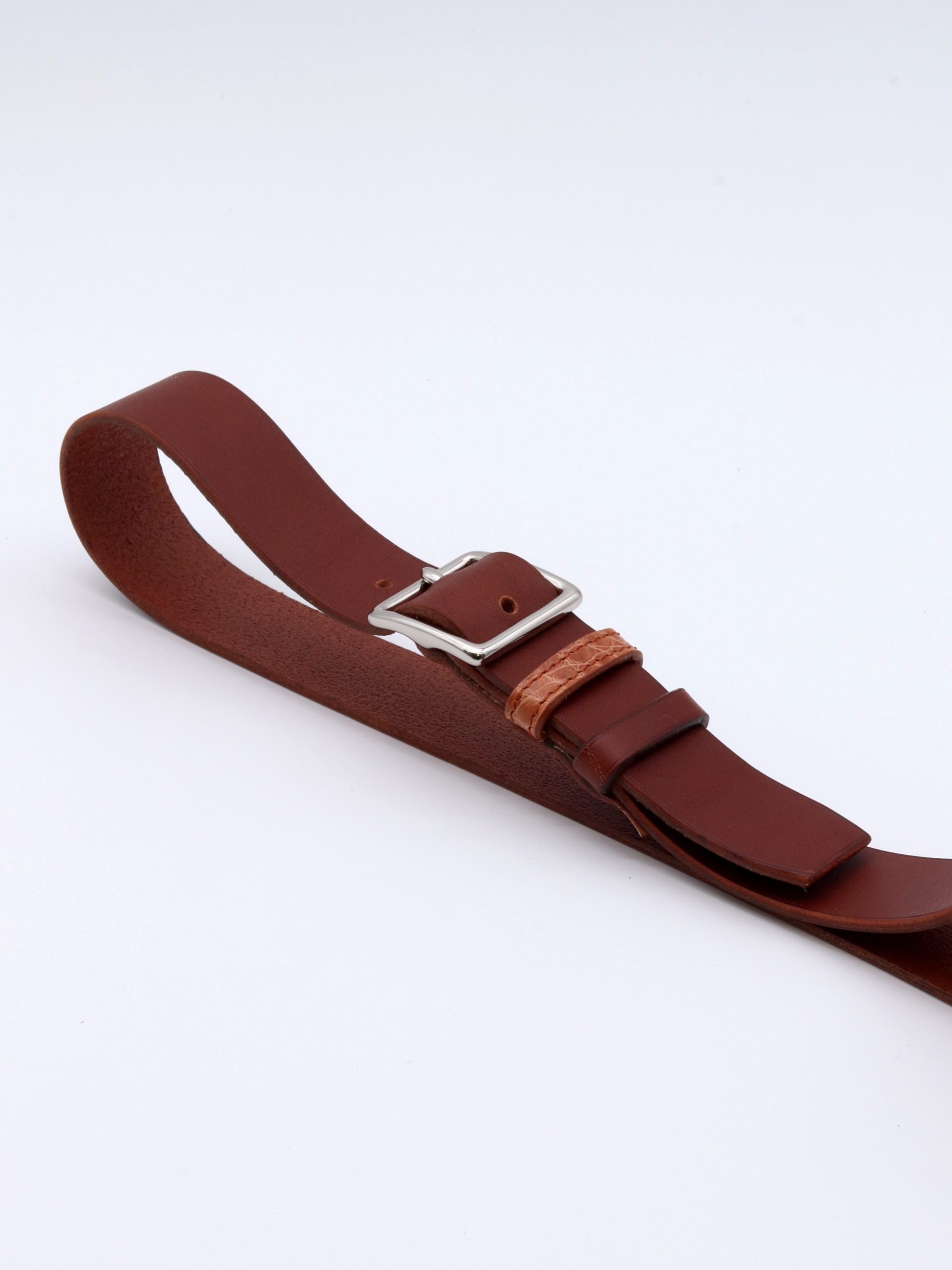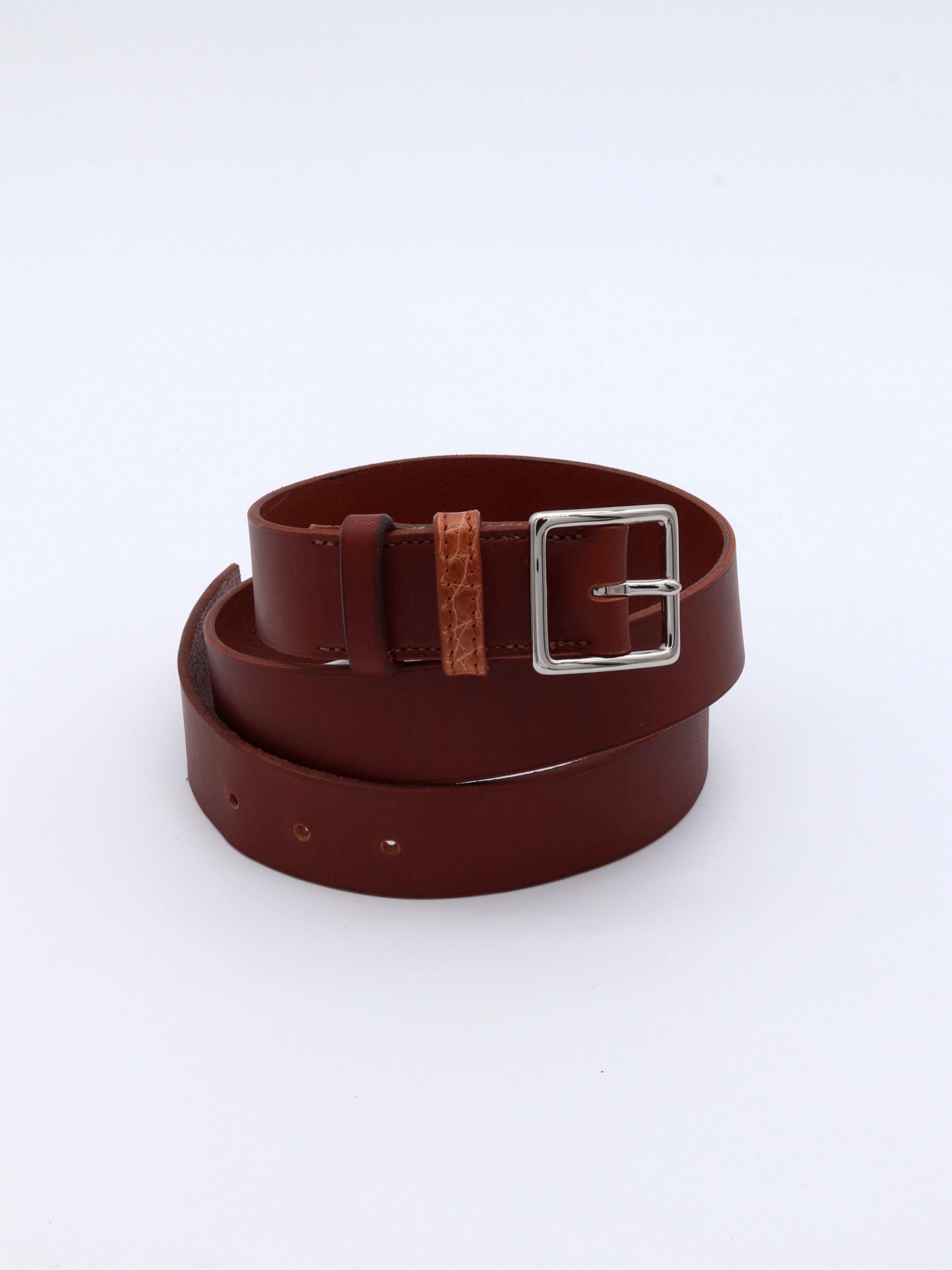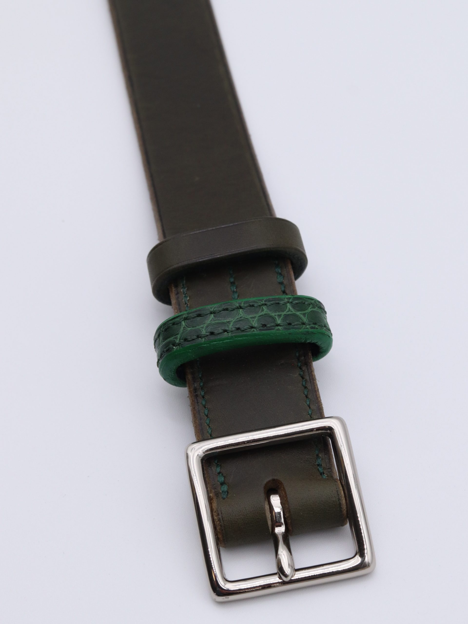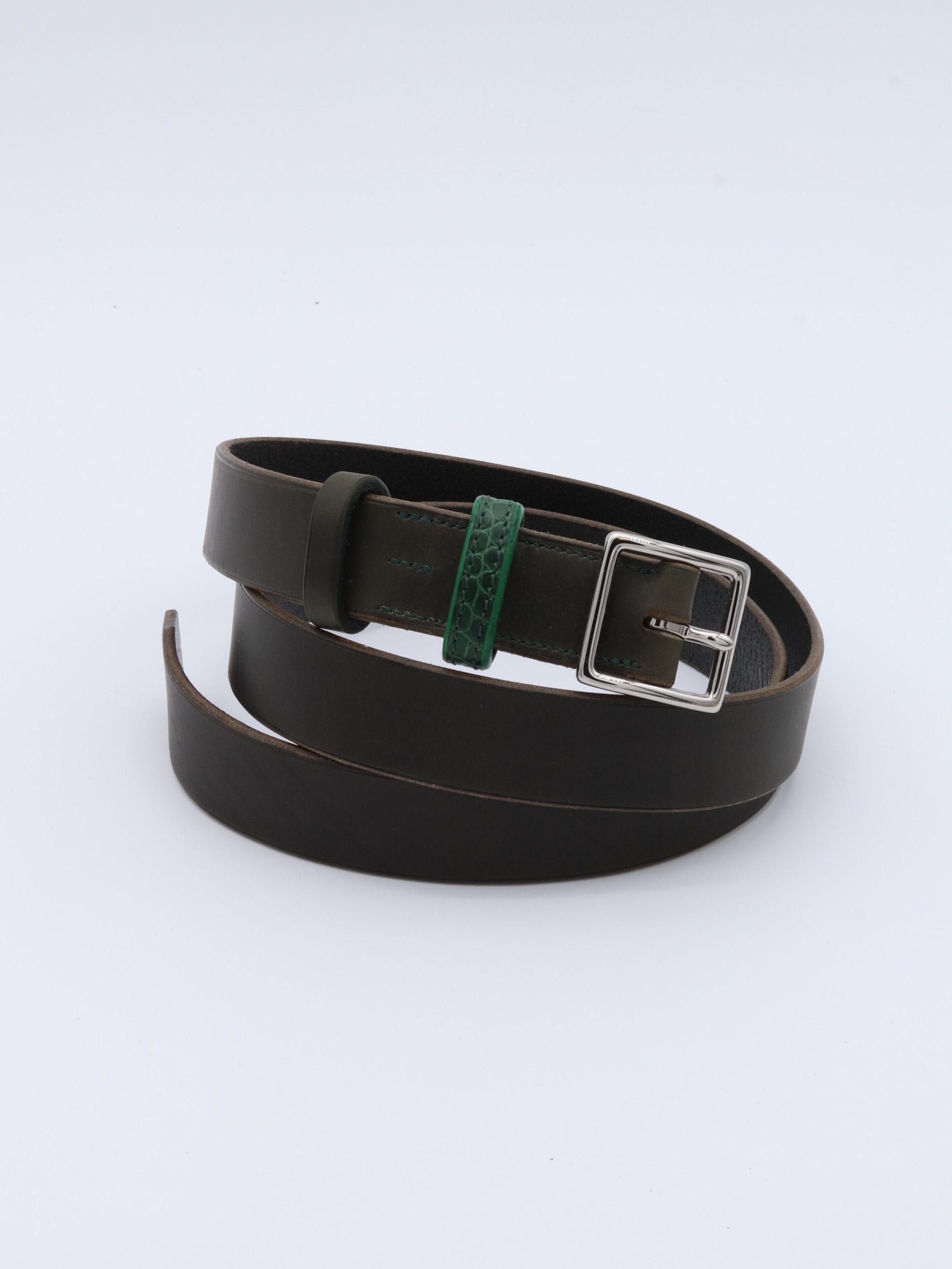 Ceinture fine en cuir de sellerie, entièrement cousue à la main, alliant élégance et raffinement. Ses passants contrastés en cuir lisse et alligator apportent une touche subtile de caractère, tandis que la boucle carrée souligne sa sobriété. Disponible en noir, marron et vert bouteille.