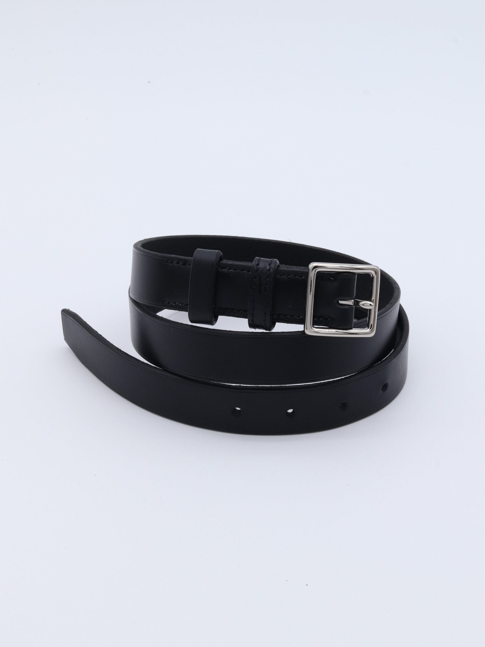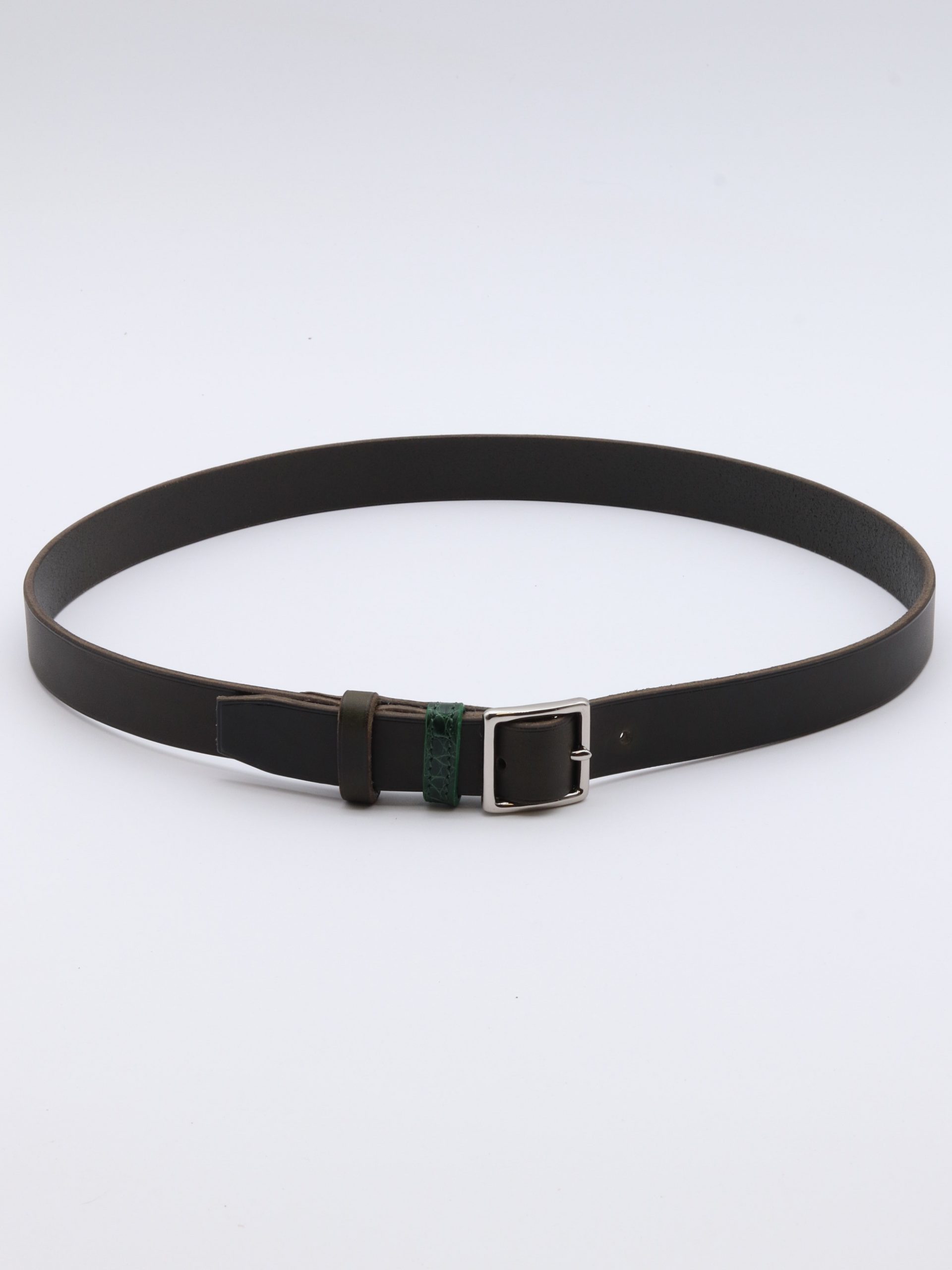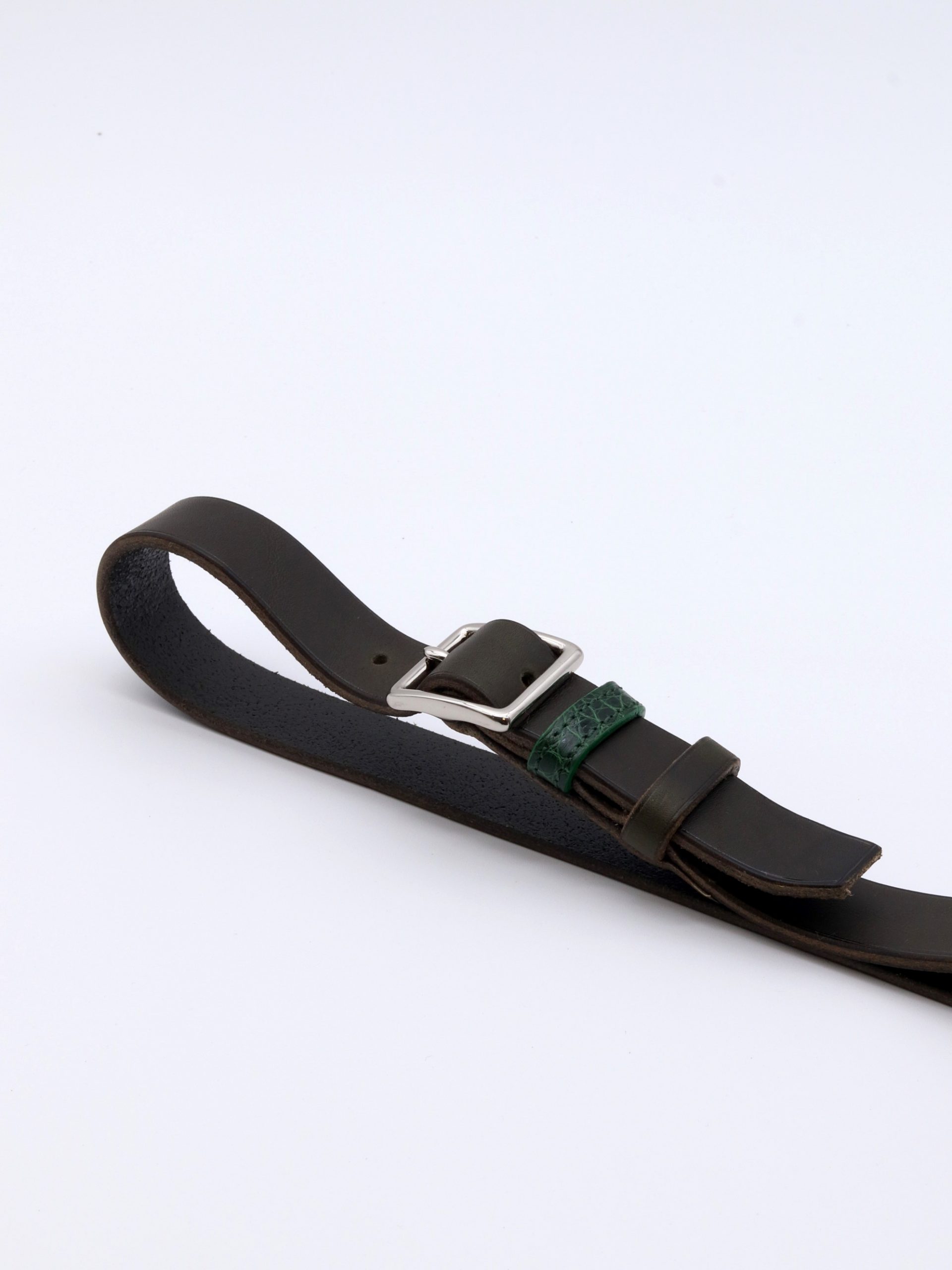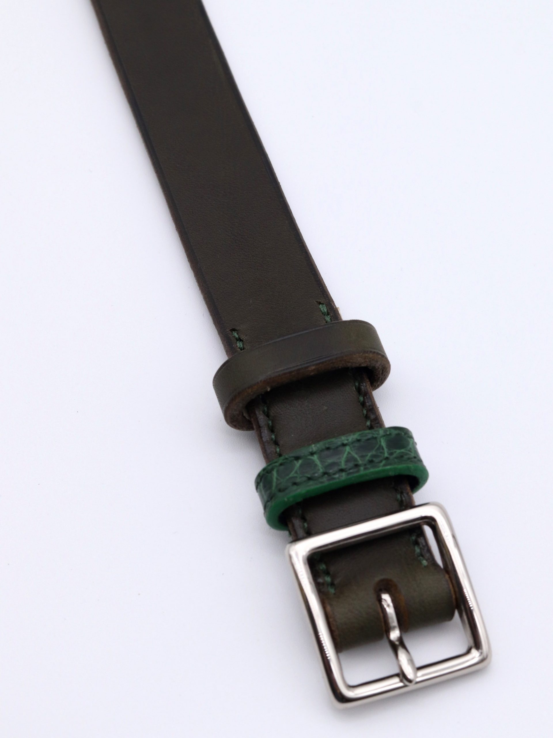Ceinture fine en cuir de sellerie, entièrement cousue à la main, alliant élégance et raffinement. Ses passants contrastés en cuir lisse et alligator apportent une subtile touche de caractère, tandis que la boucle carrée souligne sa sobriété. Disponible en noir, marron et vert bouteille.