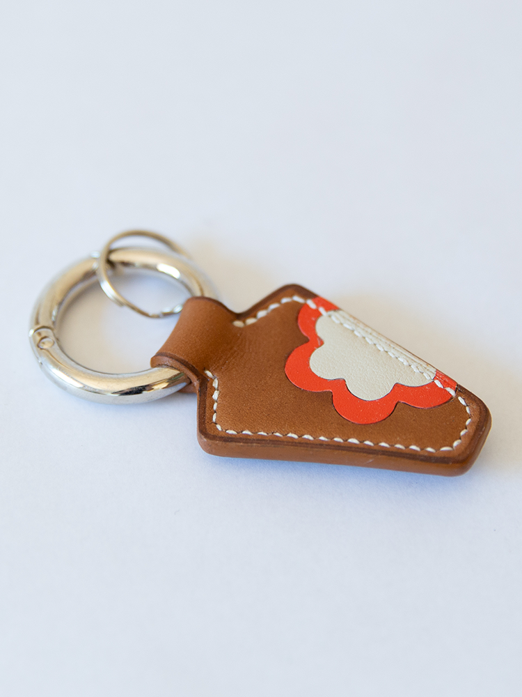 Porte-clefs ou bijoux de sac, cet objet reprend une forme signature que l’on retrouve sur le sac Aubépine. Il s’inscrit dans une continuité formelle. Plus qu’un simple accessoire, il devient un écho discret à l’identité de la marque. Ici avec un travail de marqueterie en forme de fleur rappelant l’univers seventys de la maison.