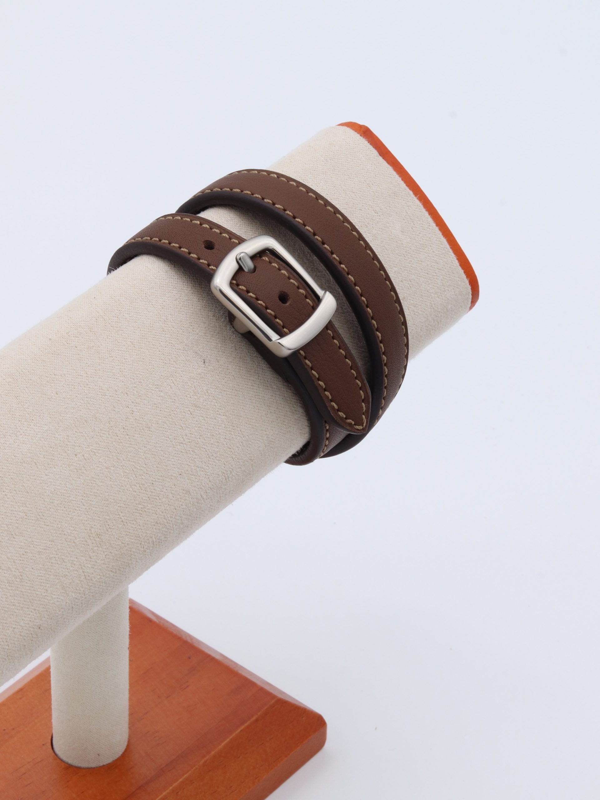 Bracelet double tour en cuir de veau couleur chocolat, élégant et léger, il épouse délicatement le poignet. Entièrement doublé, il se ferme par une boucle brossée au style raffiné, alliant confort et sophistication.