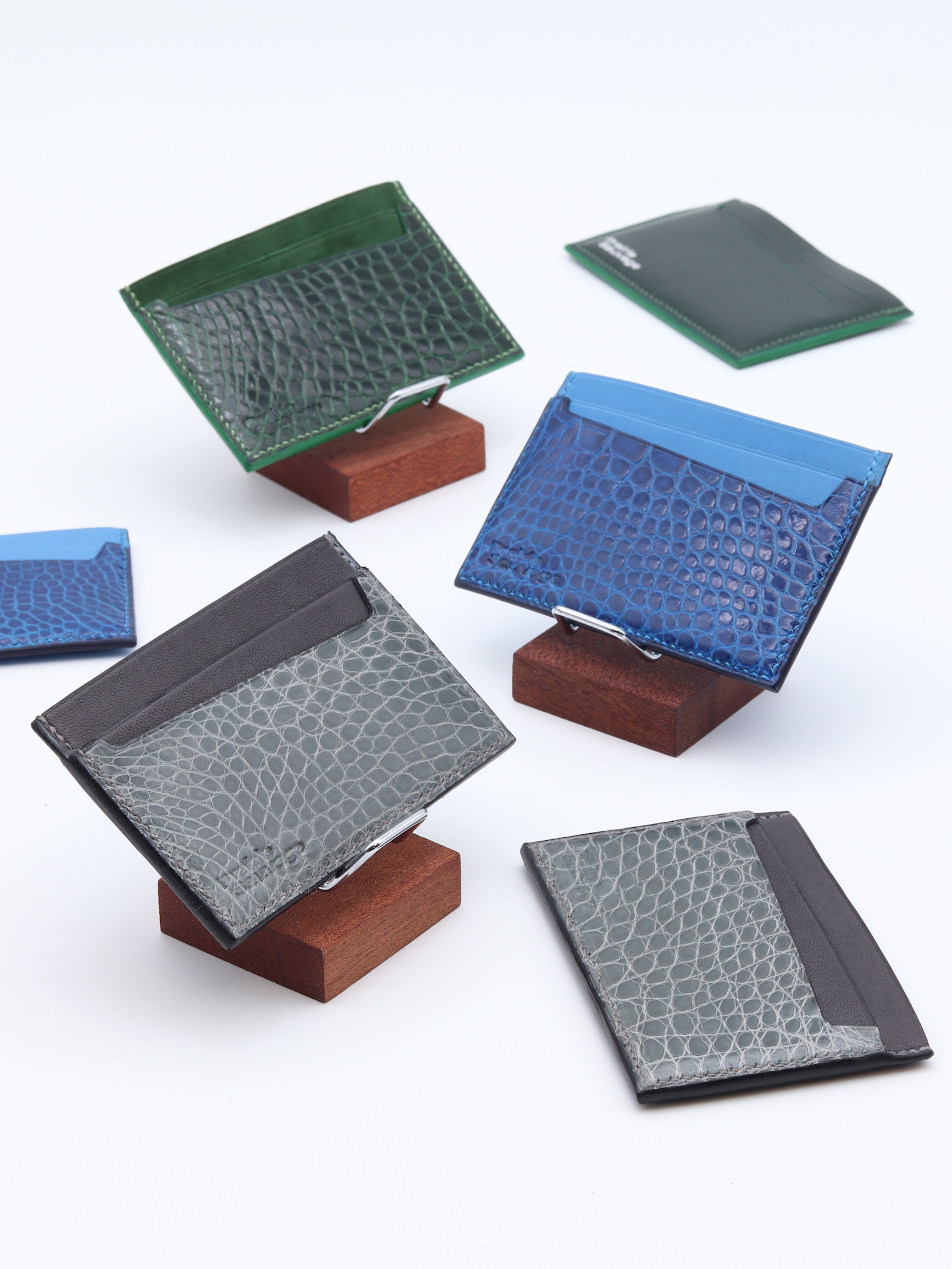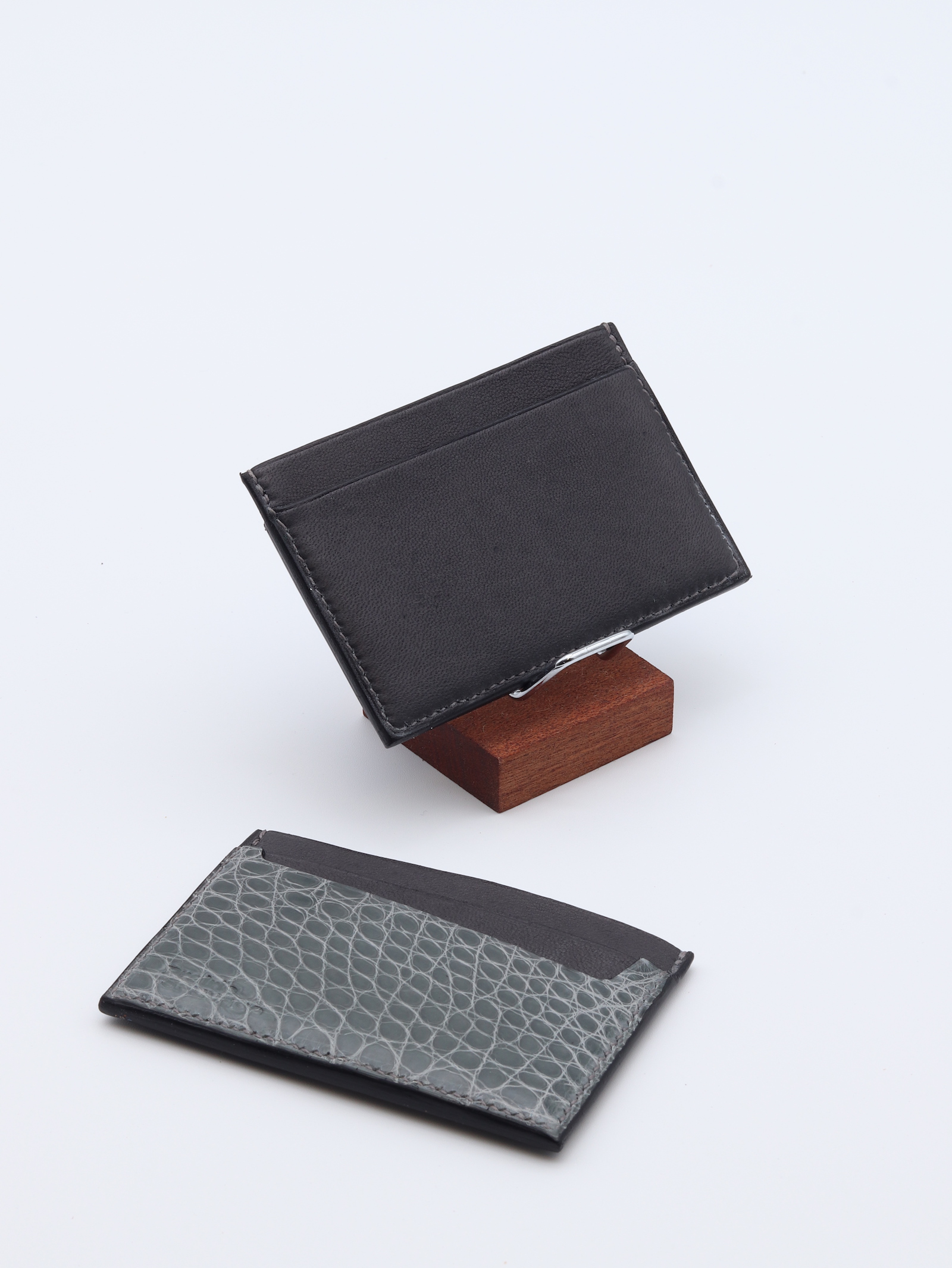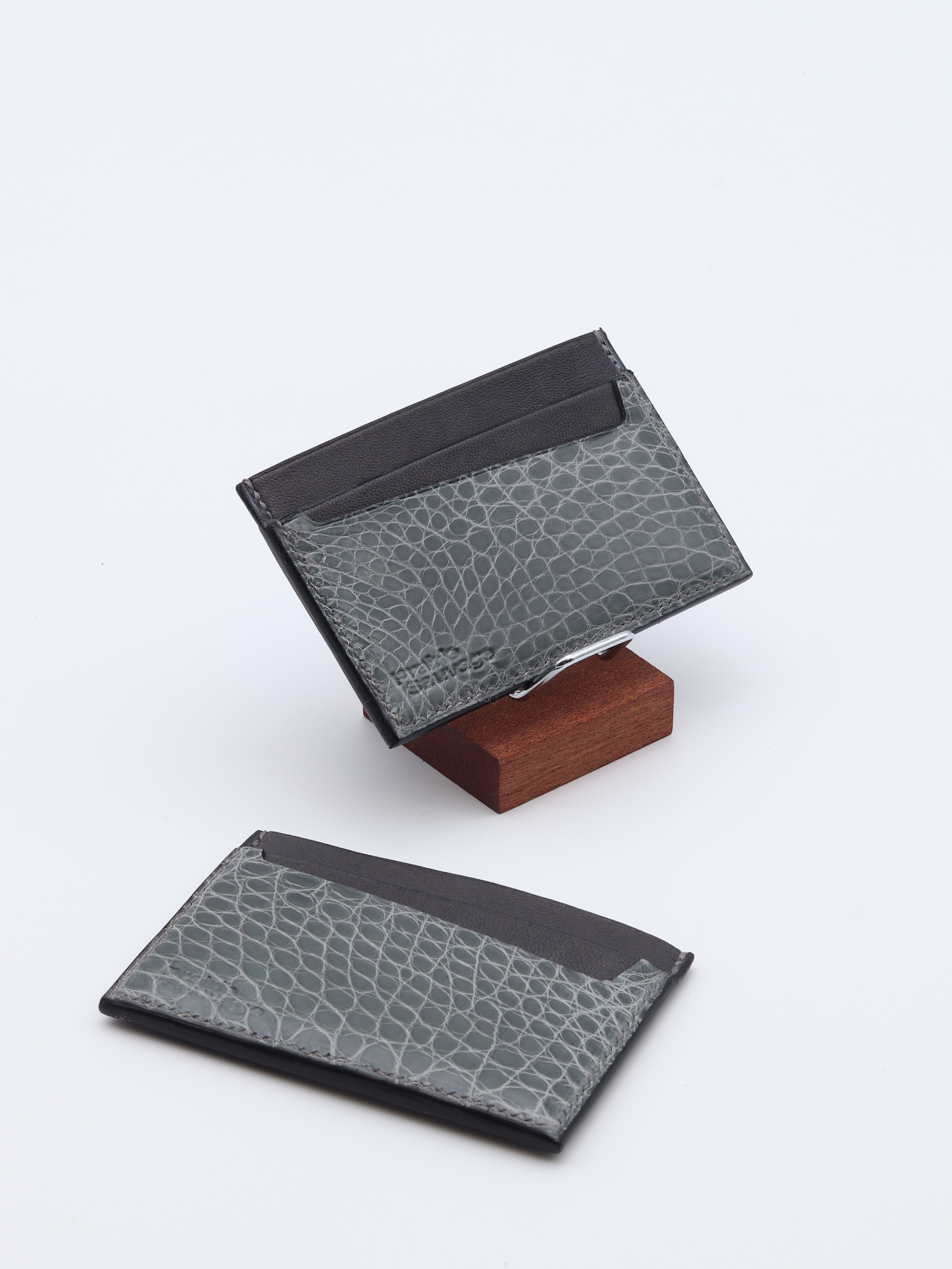 Porte-carte confectionné en cuir de chèvre gris et en alligator brillant, pensé pour les amateurs de peaux précieuses. Sa silhouette raffinée est rehaussée par le décroché emblématique de la maison, conçu pour saisir chaque carte avec aisance. Entièrement cousu à la main, il incarne un savoir-faire artisanal exigeant.