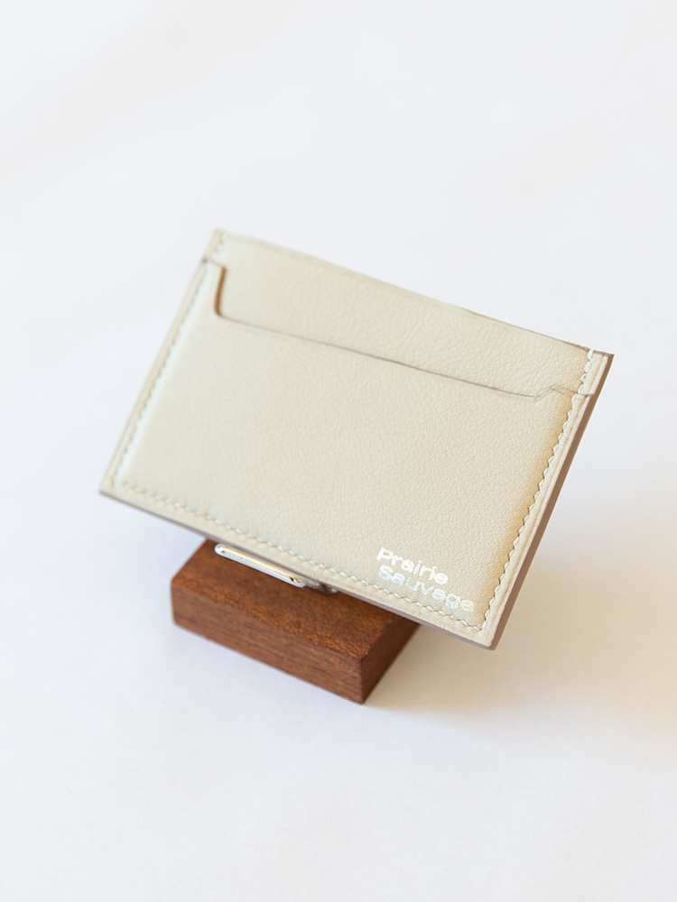 Porte-carte en cuir couleur crème. Forme élégante avec son décroché emblématique de la maison, permet de saisir avec aisance la carte.
