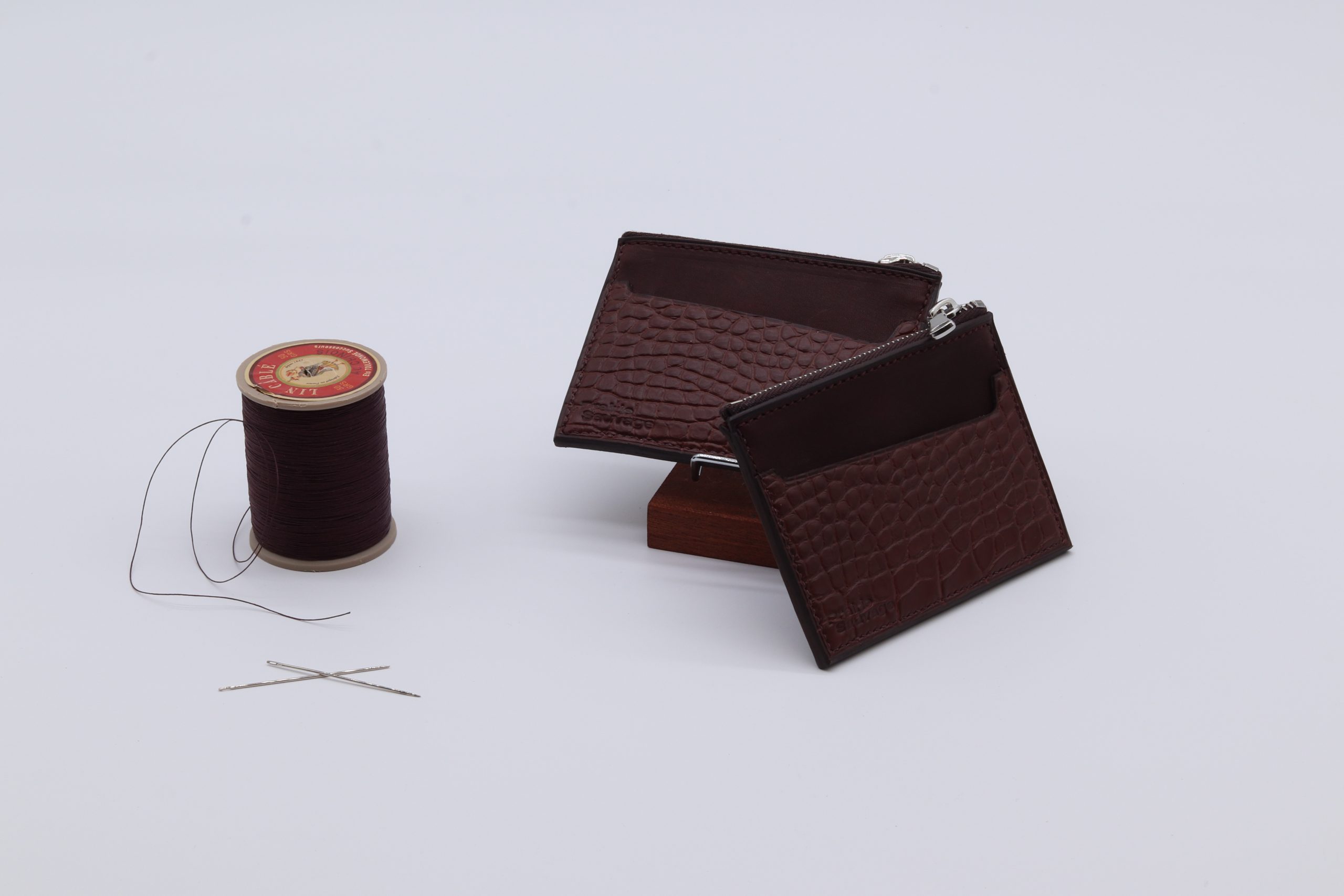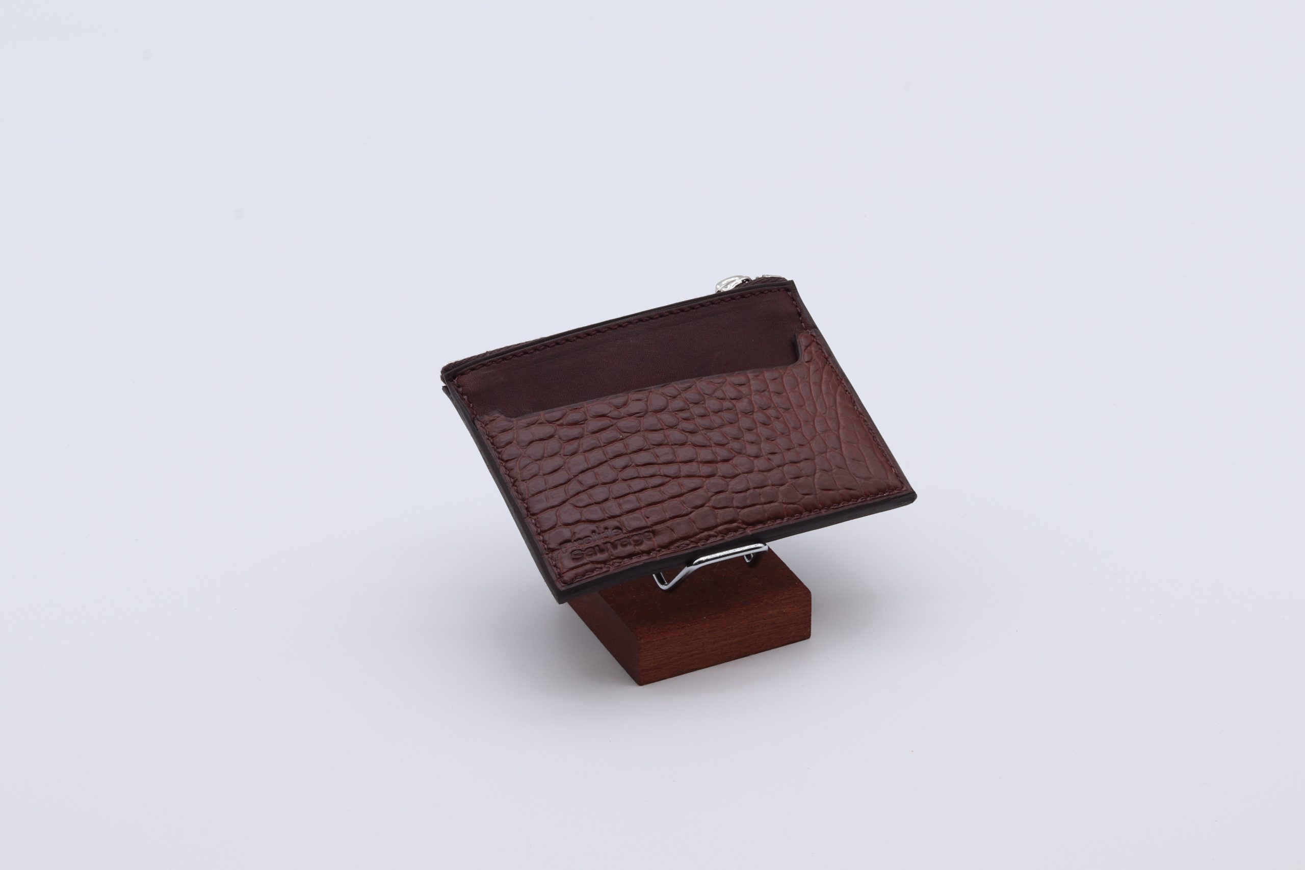Porte-carte confectionné en cuir de veau Barénia et en alligator couleur chocolat, pensé pour les amateurs de matières d’exception. Plus qu’un simple porte-carte, il offre une poche zippée, idéale pour glisser quelques pièces ou petits essentiels. Sa silhouette raffinée est rehaussée par le décroché emblématique de la maison, conçu pour saisir chaque carte avec aisance. Entièrement cousu à la main, il incarne un savoir-faire artisanal exigeant.